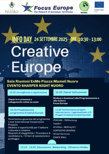 On 24 September 2025, Art4Sea was among the projects presented at the Creative Europe INFO DAY, organized by the Municipality of Nuoro with Focus Europe ETS. The event, dedicated to the International Cooperation Projects line of the Creative Europe Programme, was part of the European Researchers’Night in Nuoro, linking research and culture to raise public awareness and foster dialogue between science and society. The INFO DAY offered participants a concrete overview of funding opportunities and highlighted success stories that can inspire new ideas.