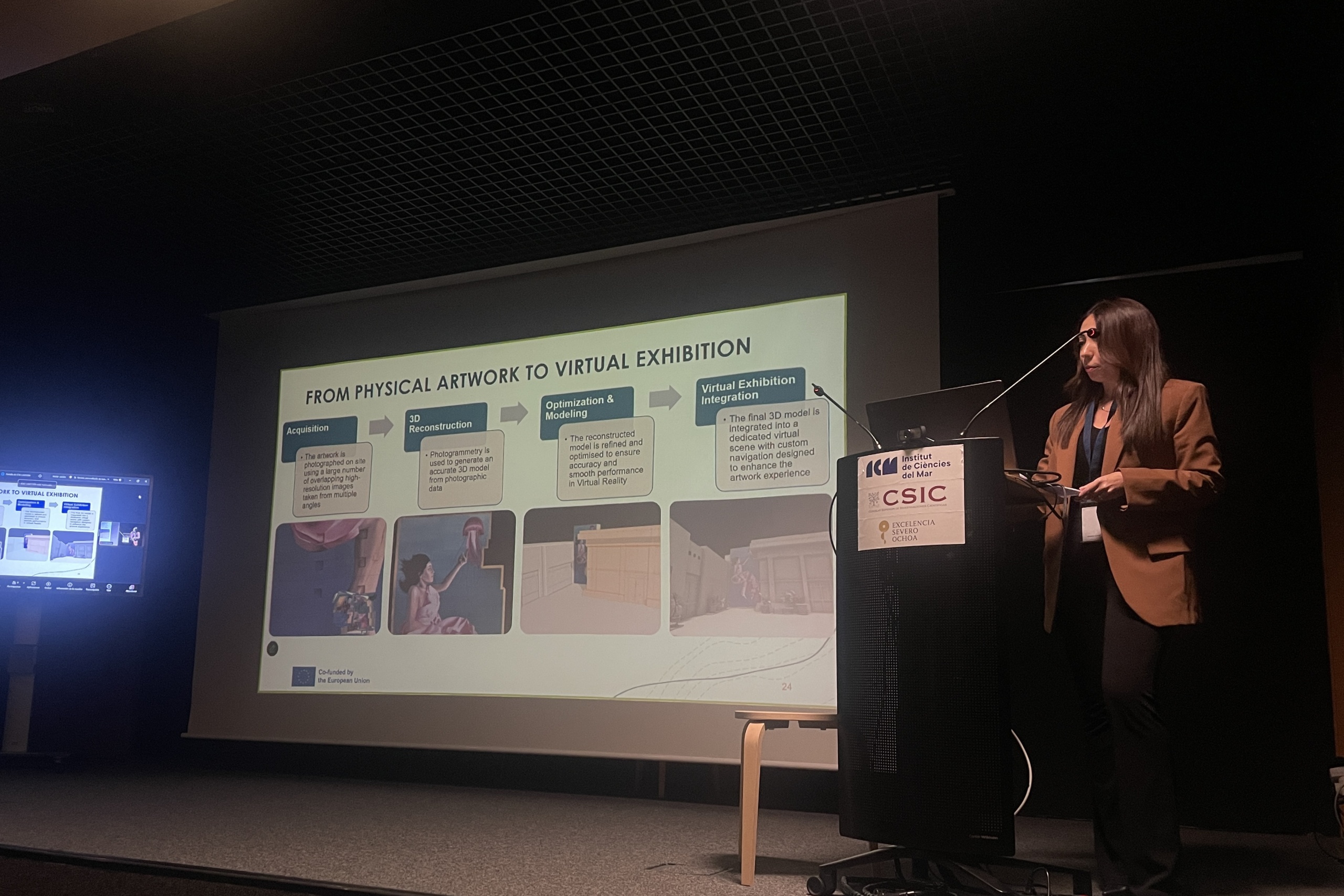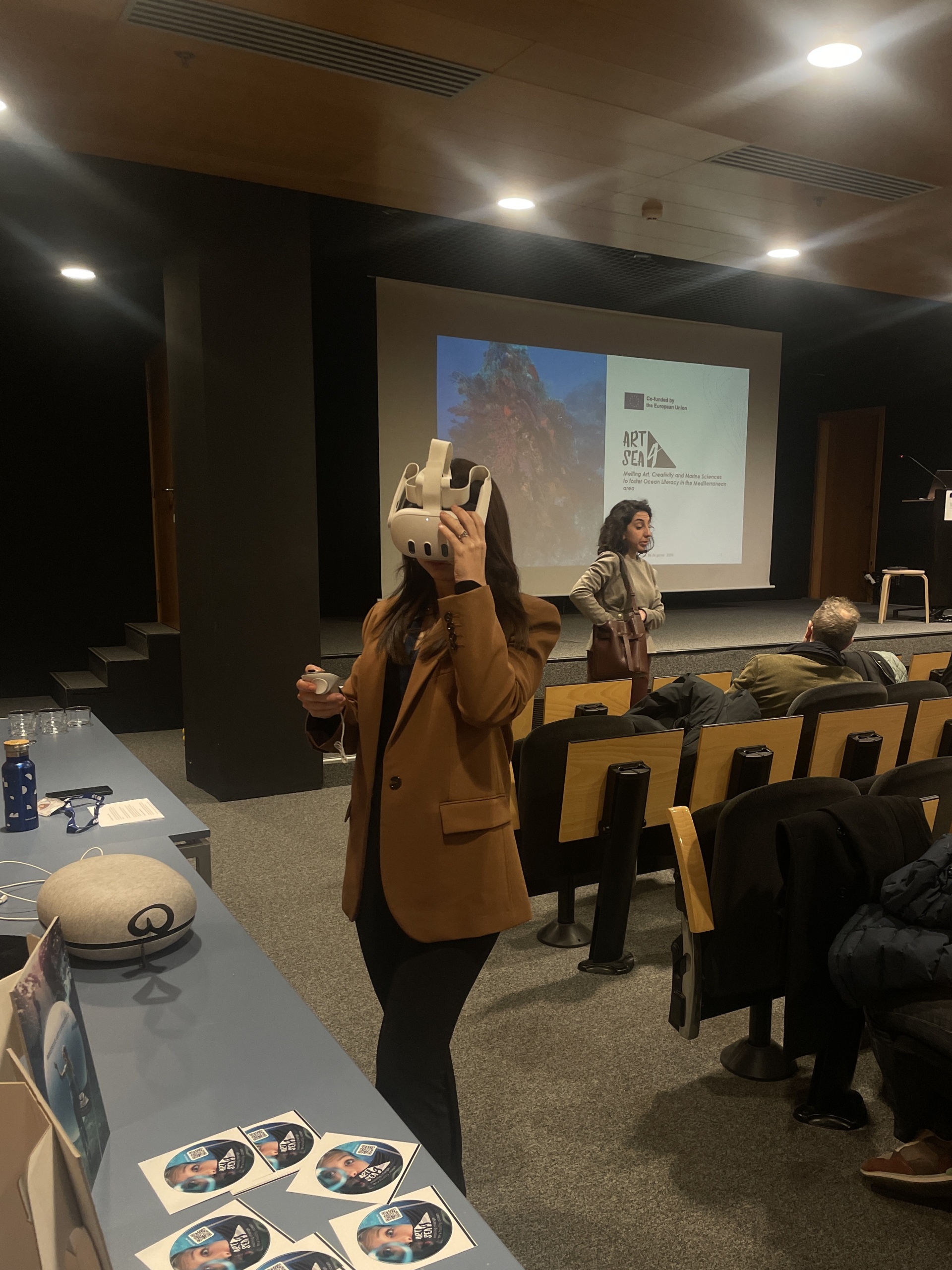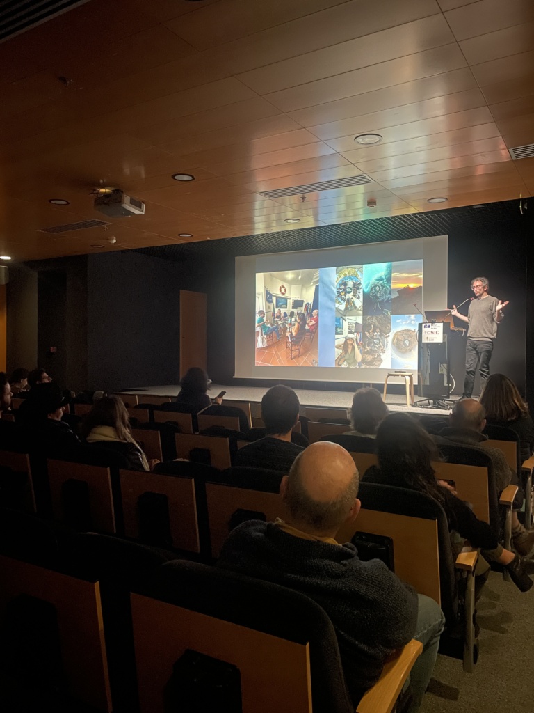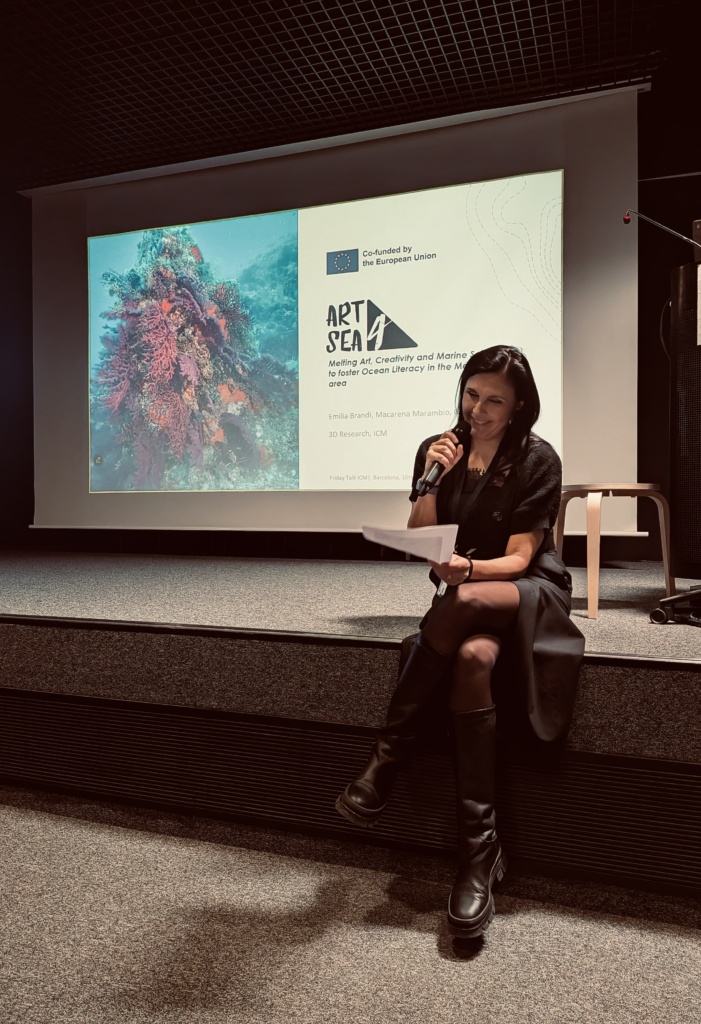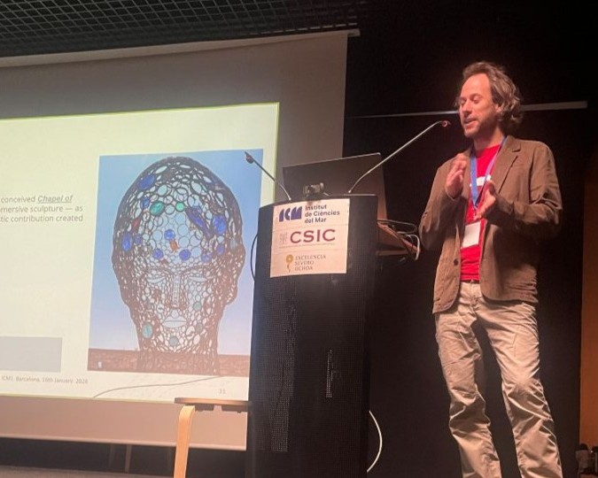 The Final Public Event on 16 January brought Art4Sea to a wider audience in two complementary sessions. The morning session, part of the ICM Friday Talks series, introduced the project to researchers, students, and staff. Presentations included an overview of Art4Sea by Emilia Brandi (3D Research), insights on artist training by Macarena Marambio (ICM-CSIC), and the Virtual Exhibition by Gloria Morabito (3DR). Four artists contributed — two in person (Carlos Izquierdo and Michal Trpák) and two online (Sara Bonaventura andSimon Duflo) — and the session concluded with a short version of a documentary produced by 3DR, telling the story of Art4Sea across the three islands through the voices of the artists, their artworks, and the project team. The session was well attended and is available on ICM YouTube channel.